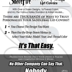 You Want to Personalize Your Motorcycles.  ShoreFire Premium Saddlebag Lid Covers are available in Over a Dozen Designs and 16 Thread Colors.  You’re sure to find a set of covers that are just right for you!!